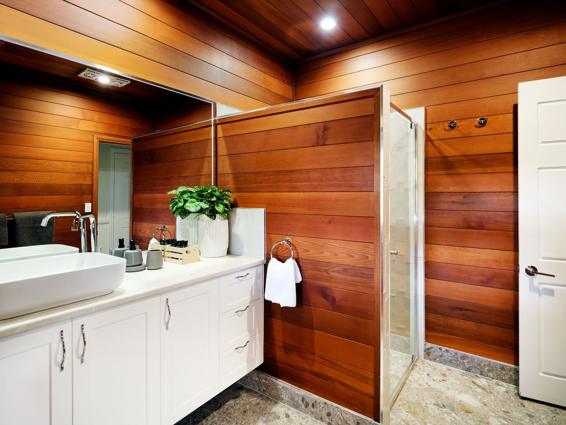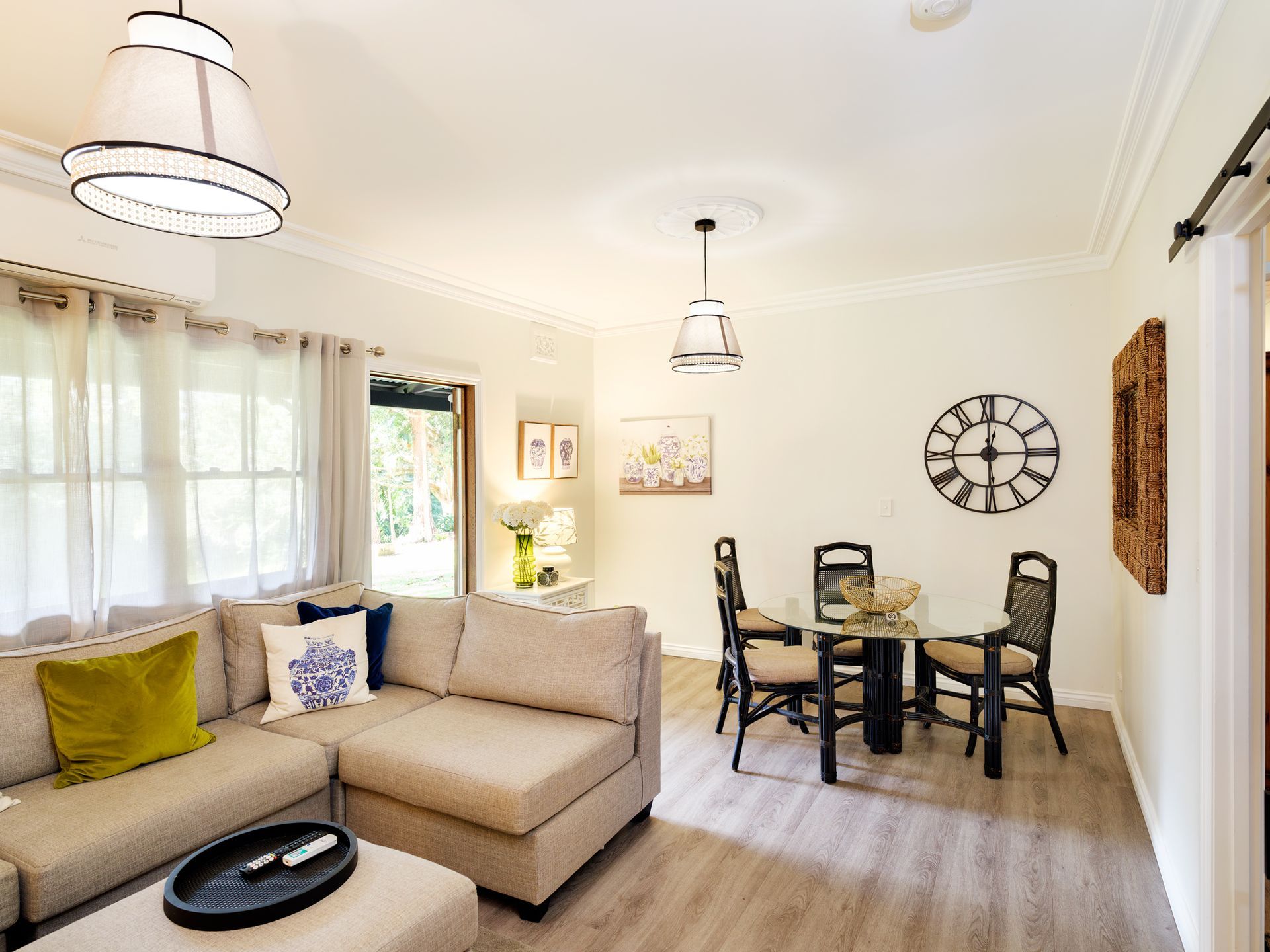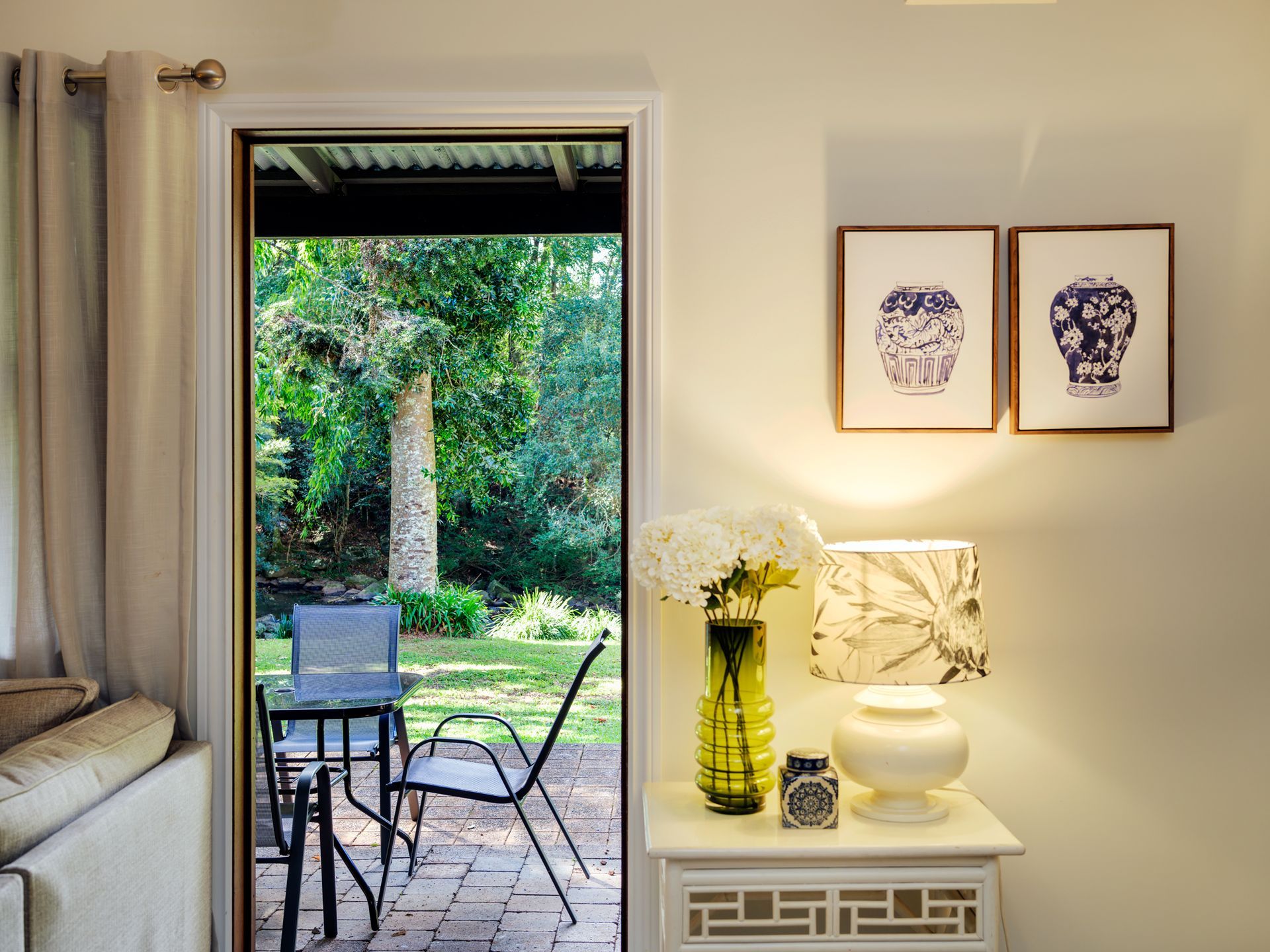 Access towards Obi Obi Creek with 2 bedrooms, one bathroom, a living room with patio overlooking the creek, plus air conditioning throughout. The bedroom with the King-sized bed features an electric fireplace and a massive walk-in wardrobe with full-length mirror. The Bunya Suite also has a kitchenette with bar fridge, microwave, kettle, toaster, hair dryer, iron and ironing board for your convenience.